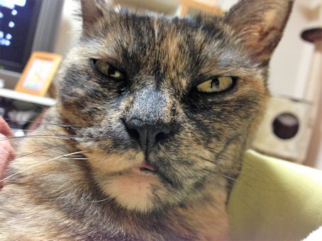 2001年の秋、にょーちゃんがまだ両手にちょうど乗るくらいの子猫の頃、当時の私の職場の駐車場で昼過ぎ、ガリガリにやせた姿でふらふら歩いていたところ、ばったり私と出会った。一目見た瞬間、私はそのブサかわいい子猫を大好きになったが、連れて帰るにはまず仕事を終えなければならなかった。そこで、すりすりしてくるにょーちゃんと約束をした。「仕事してから一緒に帰るからここで待ってて」結局、その日は残業も重なって帰れたのは深夜。「きっと待ってないだろうな・・・」と思いながら駐車場へ向かう途中、「ミ~♪」というかわいい声に振り向くと、そこににょーちゃんが。寒さの中、ぶるぶる震えながら待っていて私の足にすりよってきた。もちろん私はすぐに抱きかかえ、コートにくるんで温めながら連れて帰った。